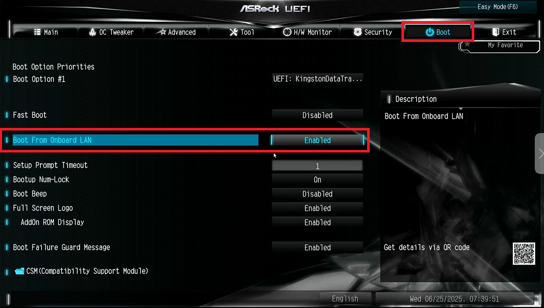 - Откройте вкладку Boot и включите параметр Boot From Onboard LAN.
