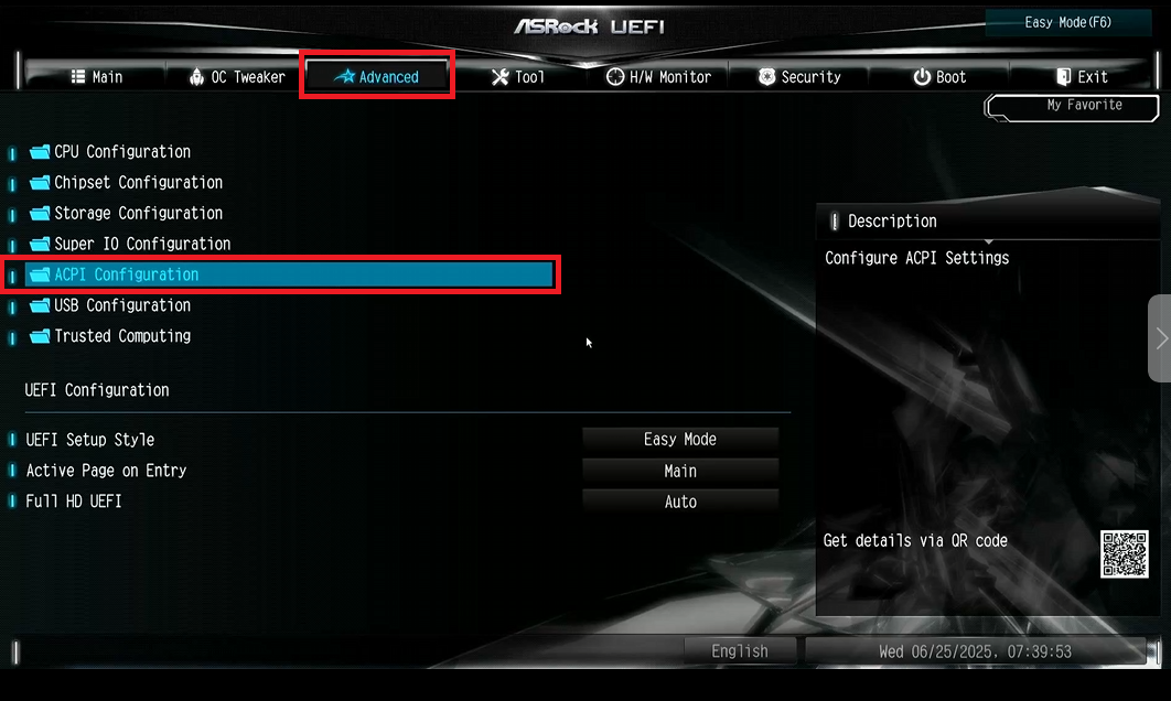 - Перейдите во вкладку Advanced и в параметр ACPI Configuration.
