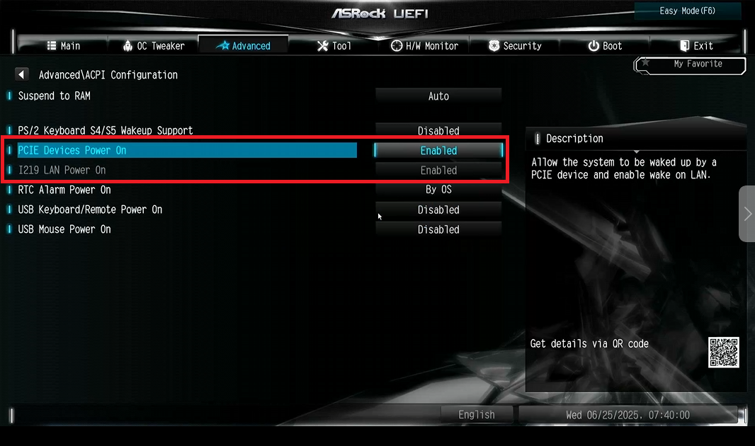 - Включите два параметра: PCIE Devices Power On, I219 LAN Power On.