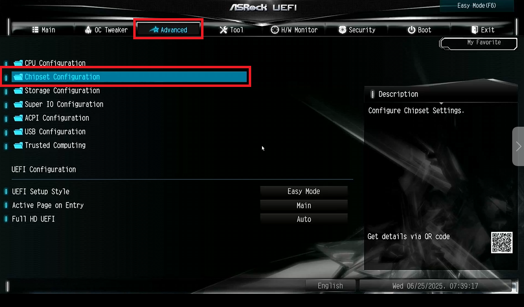 - Откройте вкладку Advanced и перейдите в параметр Chipset Configuration.
