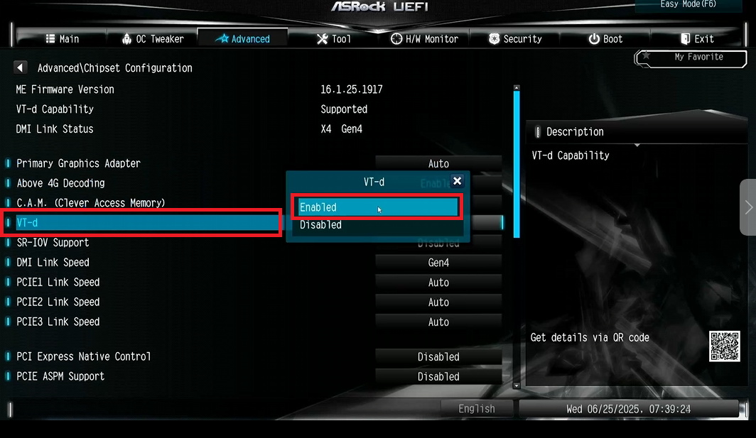- Включите параметр VT-d (Виртуализация).