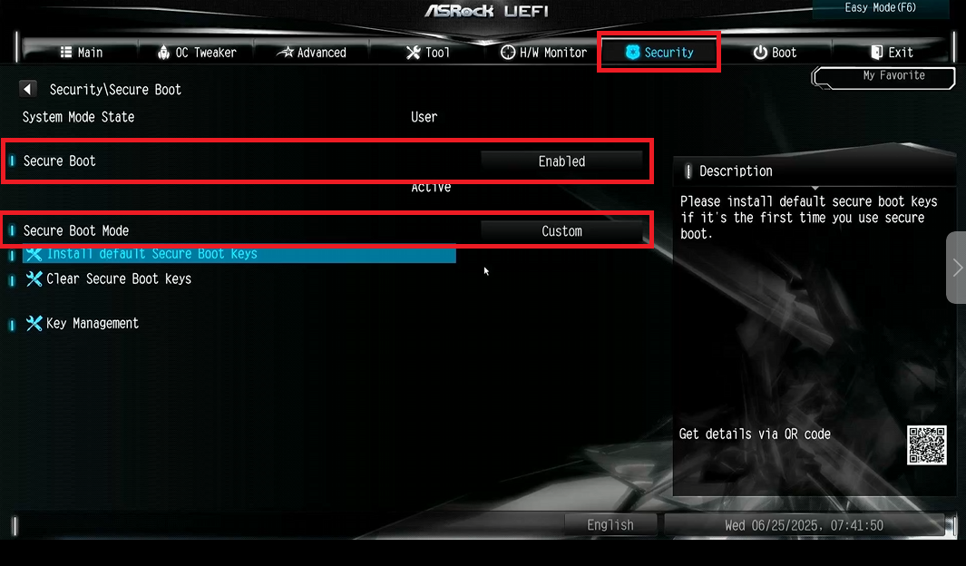 - Перейдите во вкладку Security и включите параметр Secure Boot и переключите параметр Secure Boot Mode в режим Custom.