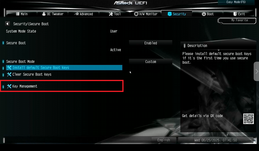 - Перейдите во вкладку Secure Boot (Security - Secure Boot) и откройте параметр Key Management.