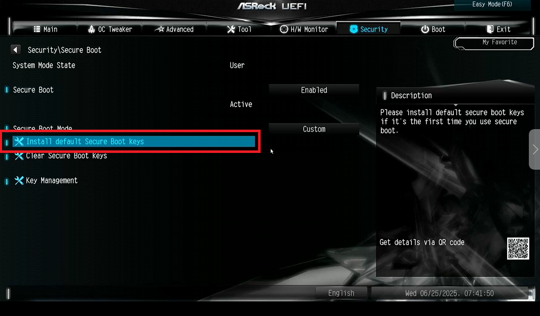 - Опуститесь к Install default Secure Boot keys и нажмите Enter, далее Yes. Далее сохраните настройки и перезагрузите ПК, после перезагрузки повторно войдите в Bios.