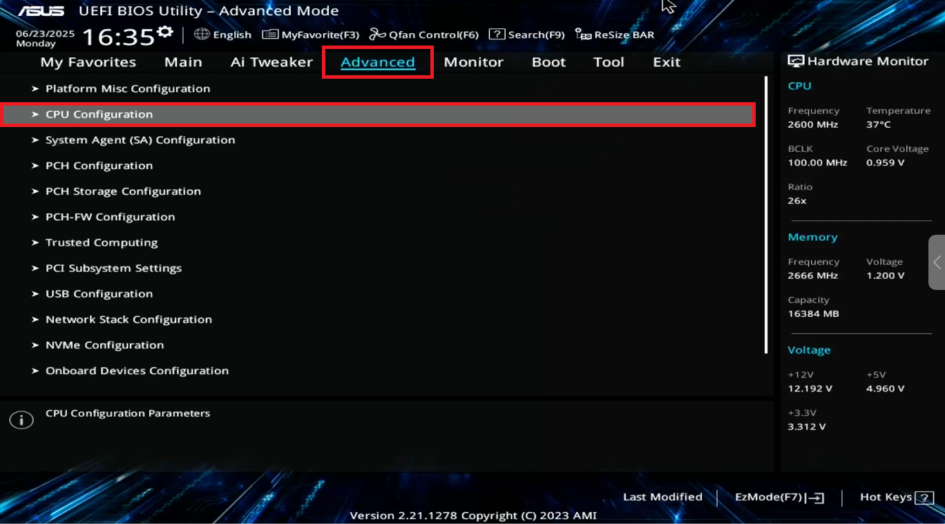 - Откройте вкладку Advanced и перейдите в параметр CPU Configuration.