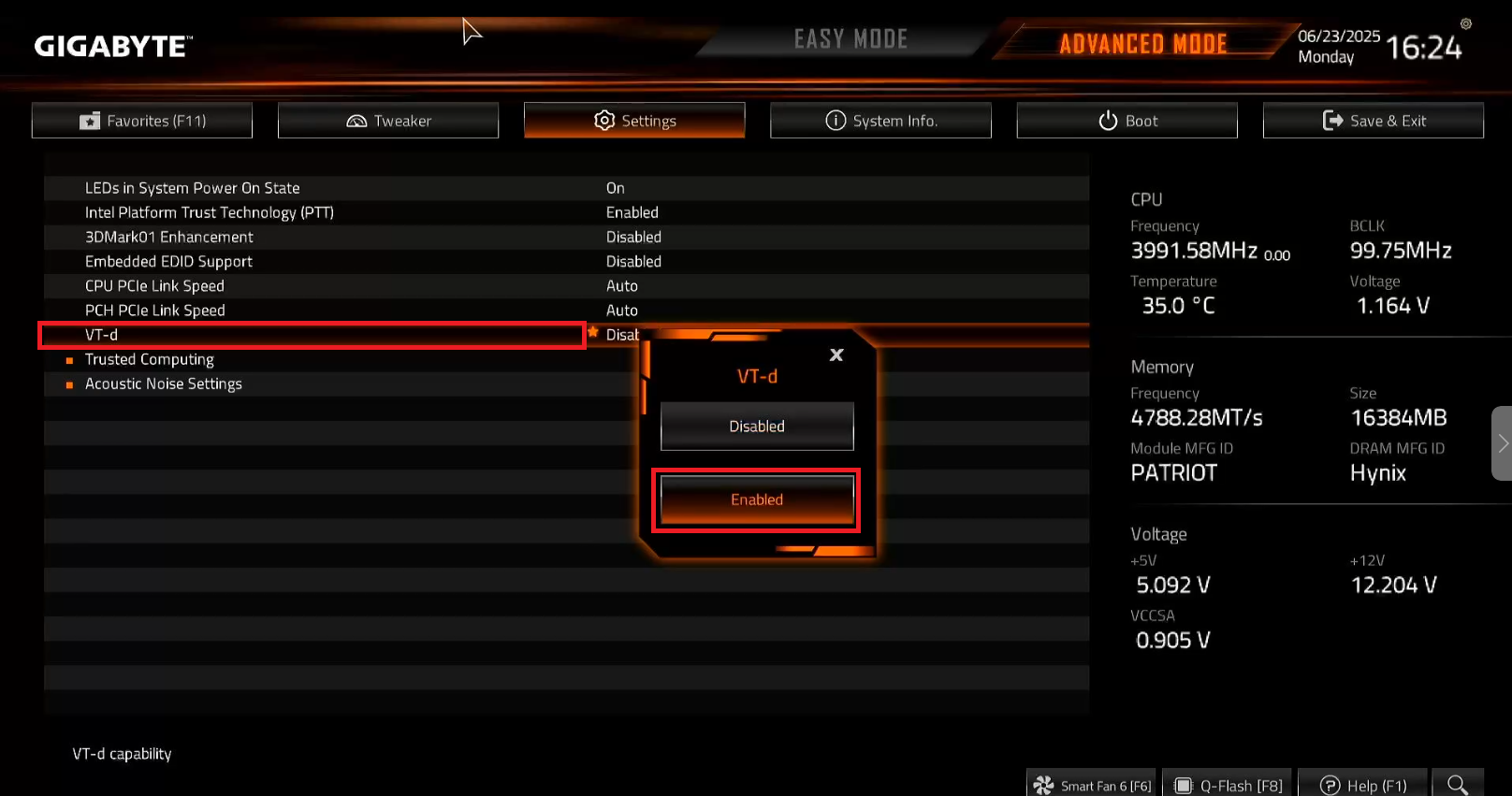- Найдите параметр VT-d (Виртуализация), включите его.