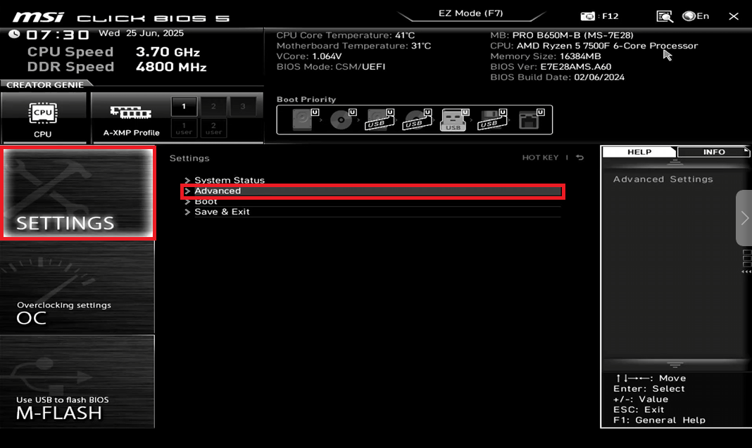 Для сохранения настроек в BIOS материнской платы MSI нужно нажать клавишу F10 после внесения изменений. После нажатия F10 появится окно подтверждения, в котором нужно выбрать "Сохранить и перезагрузить" (Save & Reset), так же вы можете войти во вкладку Settings - Save & Exit, выбрать опцию Save & Exit Setub и нажать Yes, настройки применятся и ПК перезагрузится.