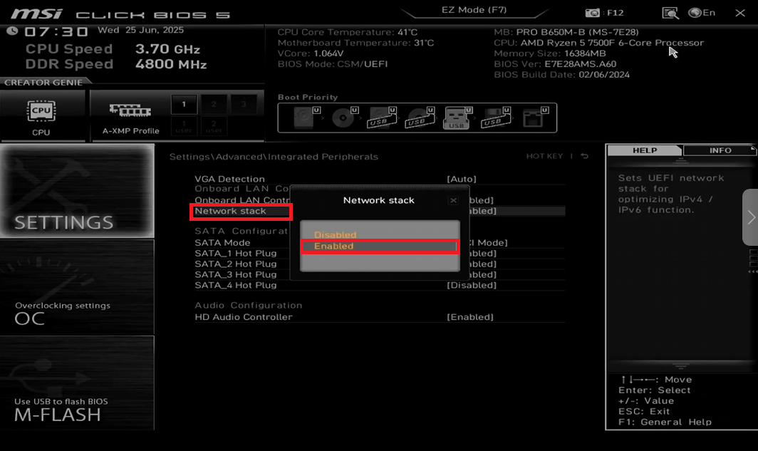 - Включите параметр Network Stack. Откроются дополнительные настройки.