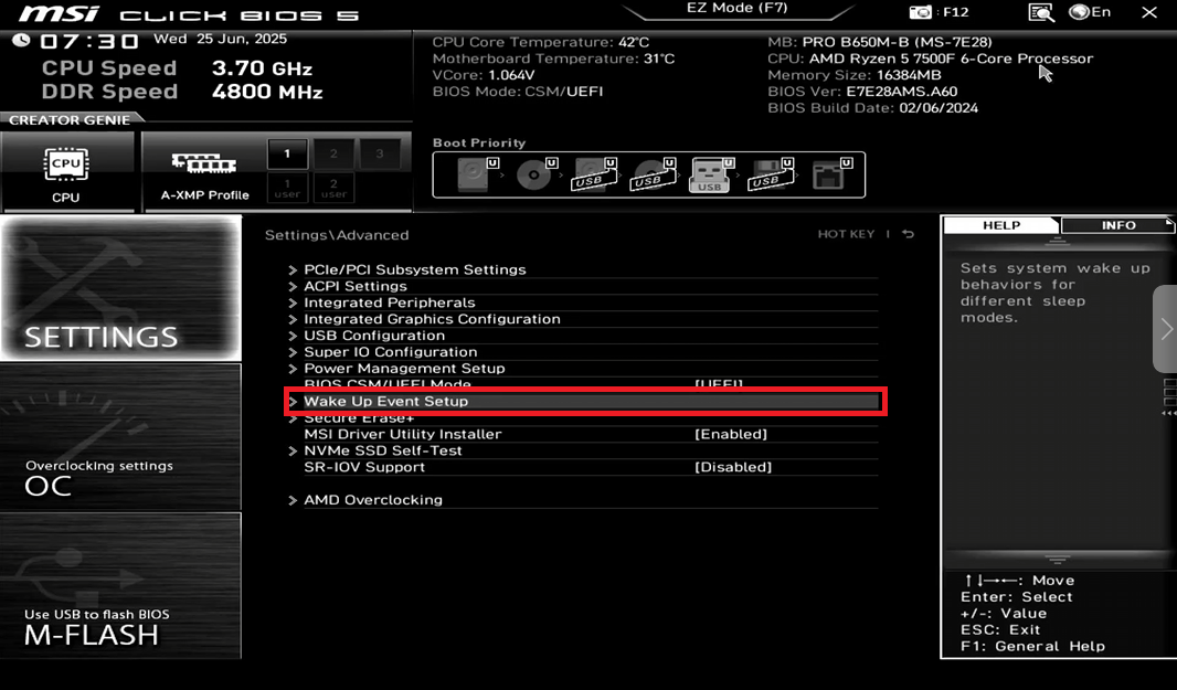 - Вернитесь во вкладку Settings - Advanced и перейдите в настройки Wake Up Event Setub.