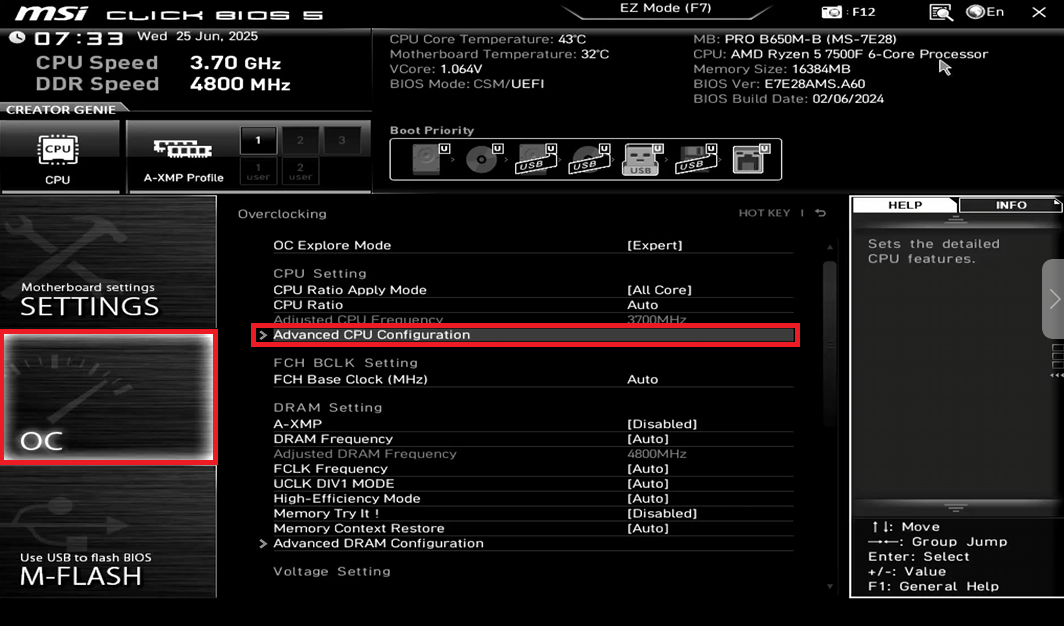 - Откройте вкладку OC и перейдите в параметр Advanced CPU Configuration.