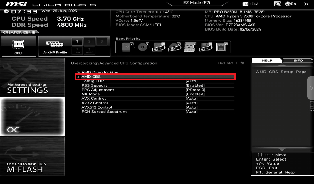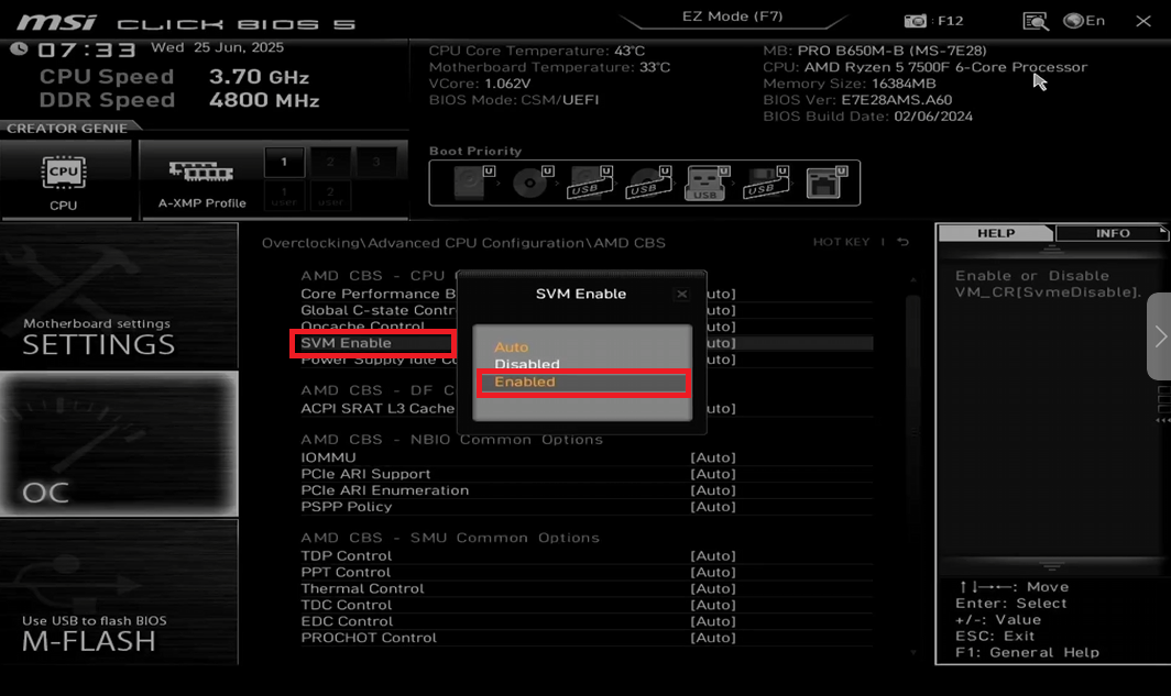 - Далее перейдите в AMD CBS и включите настройку SVM Enabled.
